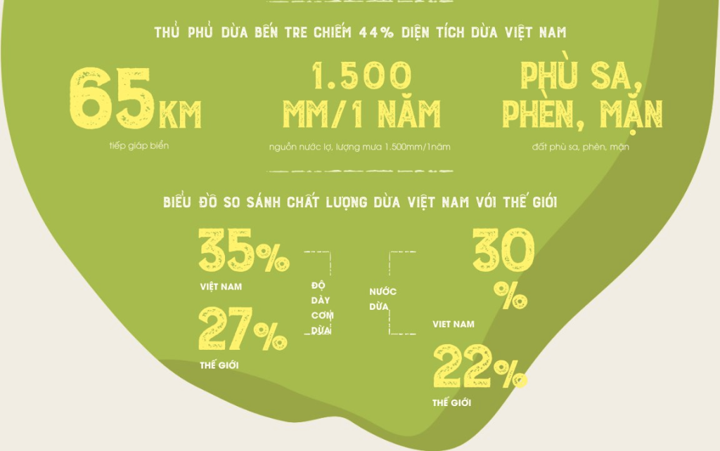 Vietnam currently has about 200,000 hectares of coconut, ranking 7th out of 93 countries worldwide, according to the Ministry of Agriculture and Rural Development. About one-third of Vietnam’s coconut growing area meets US and European organic standards, mainly in the Central Coast provinces and the Mekong Delta (Tra Vinh, Ben Tre). This creates a great advantage for exporting this fruit.